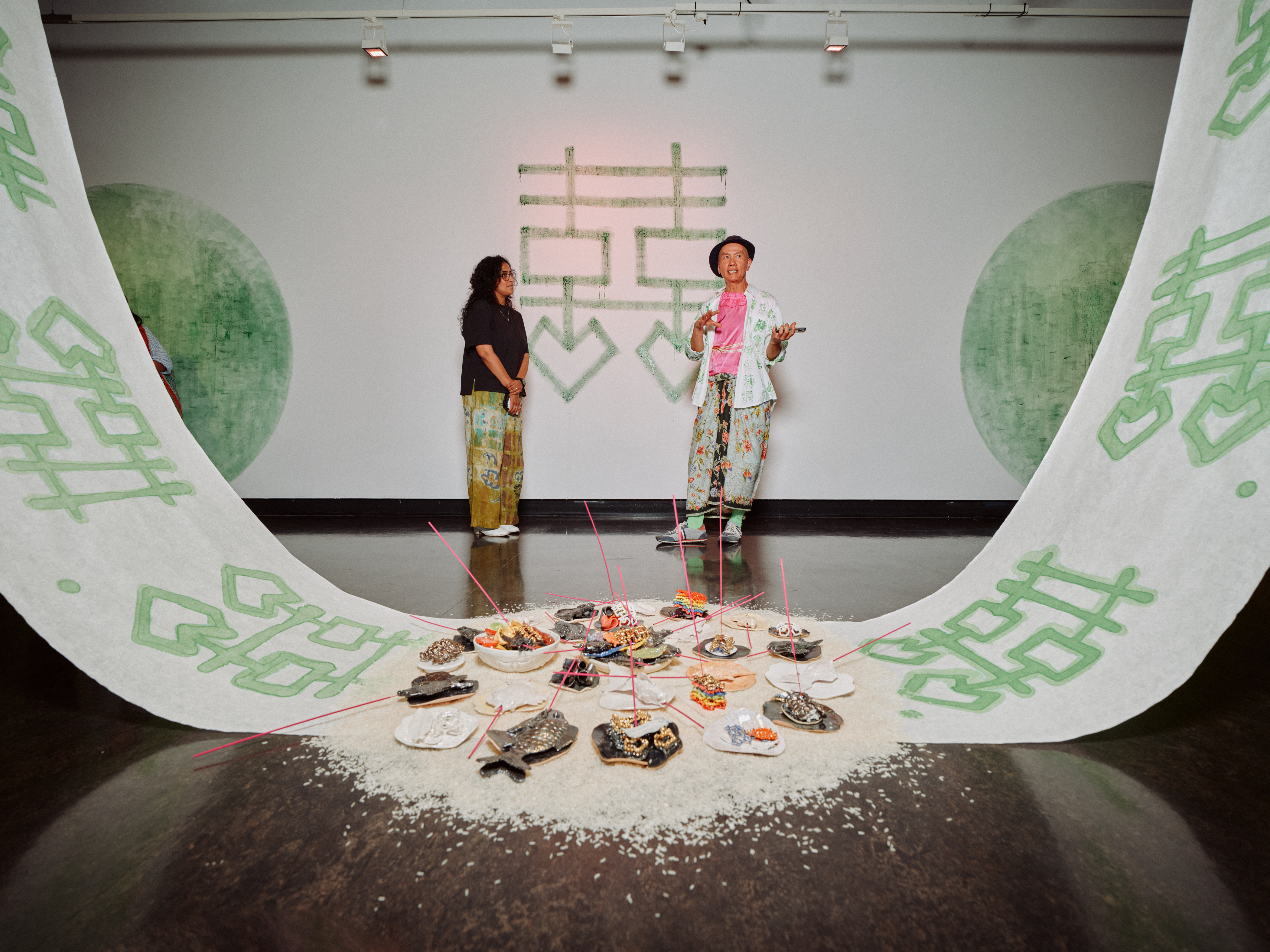 The ceramic installation and live performance are not merely artistic expressions but are also acts of cultural knowledge transmission. The artist employs these mediums to offer glimpses into the rituals of their family from a hyphenated minority, with Jayanto as an inter- faith, queer person and Peranakan-Chinese born in Indonesia. The integration of Chinese and Indonesian rituals holds deep meaning and connection for Jayanto’s family. The focus on the act of offering food, particularly in the context of the ‘Imlek’ (Chinese New Year) celebrations in Indonesia, encapsulates an essential part of the artist’s heritage: the familial bonds and kindness demonstrated through acts of sharing. In this context, the artwork does not just tell a story of personal history; it also speaks to the universal practice of migrants in sustaining relationships through food, ritual, and memory.