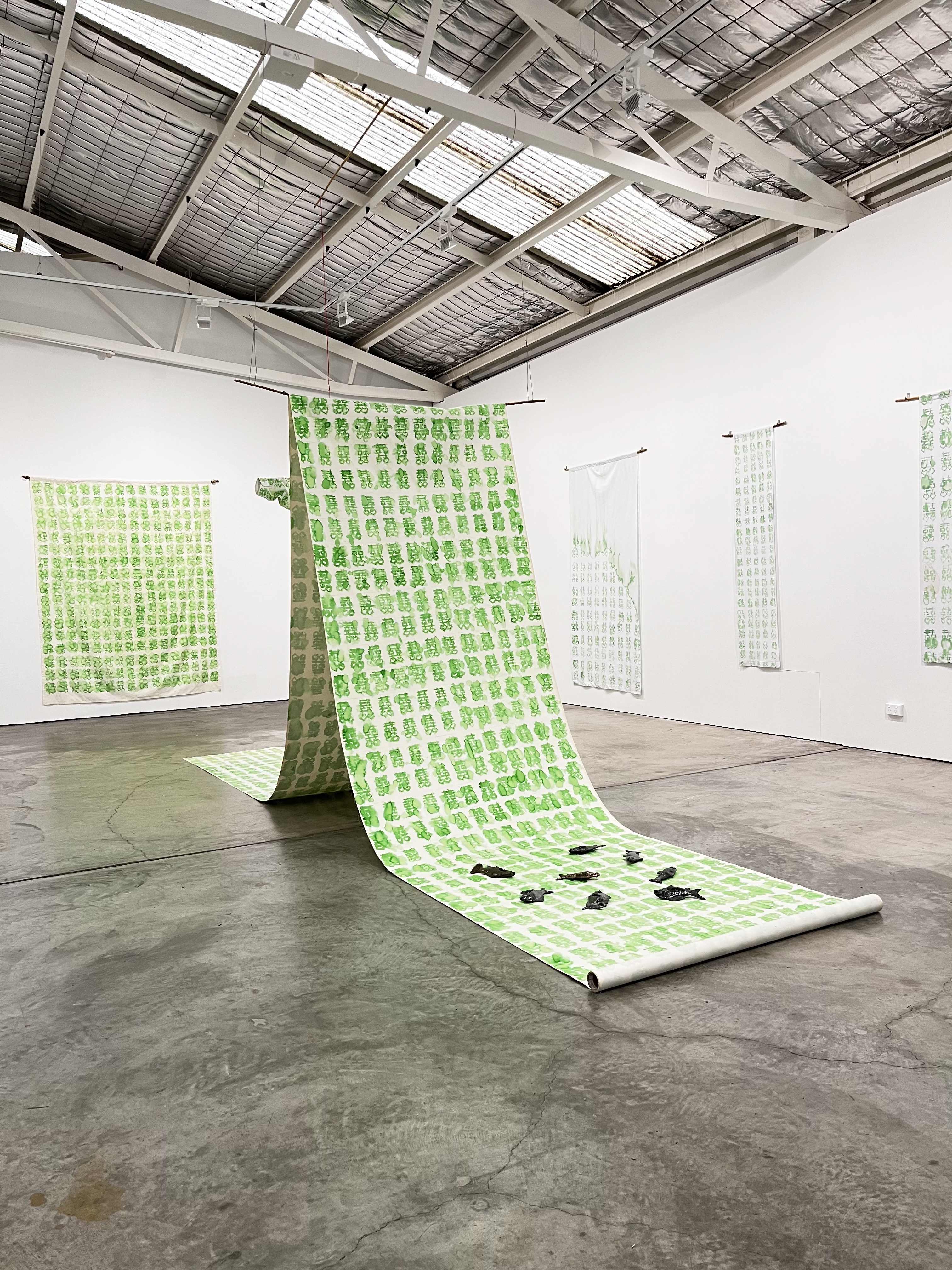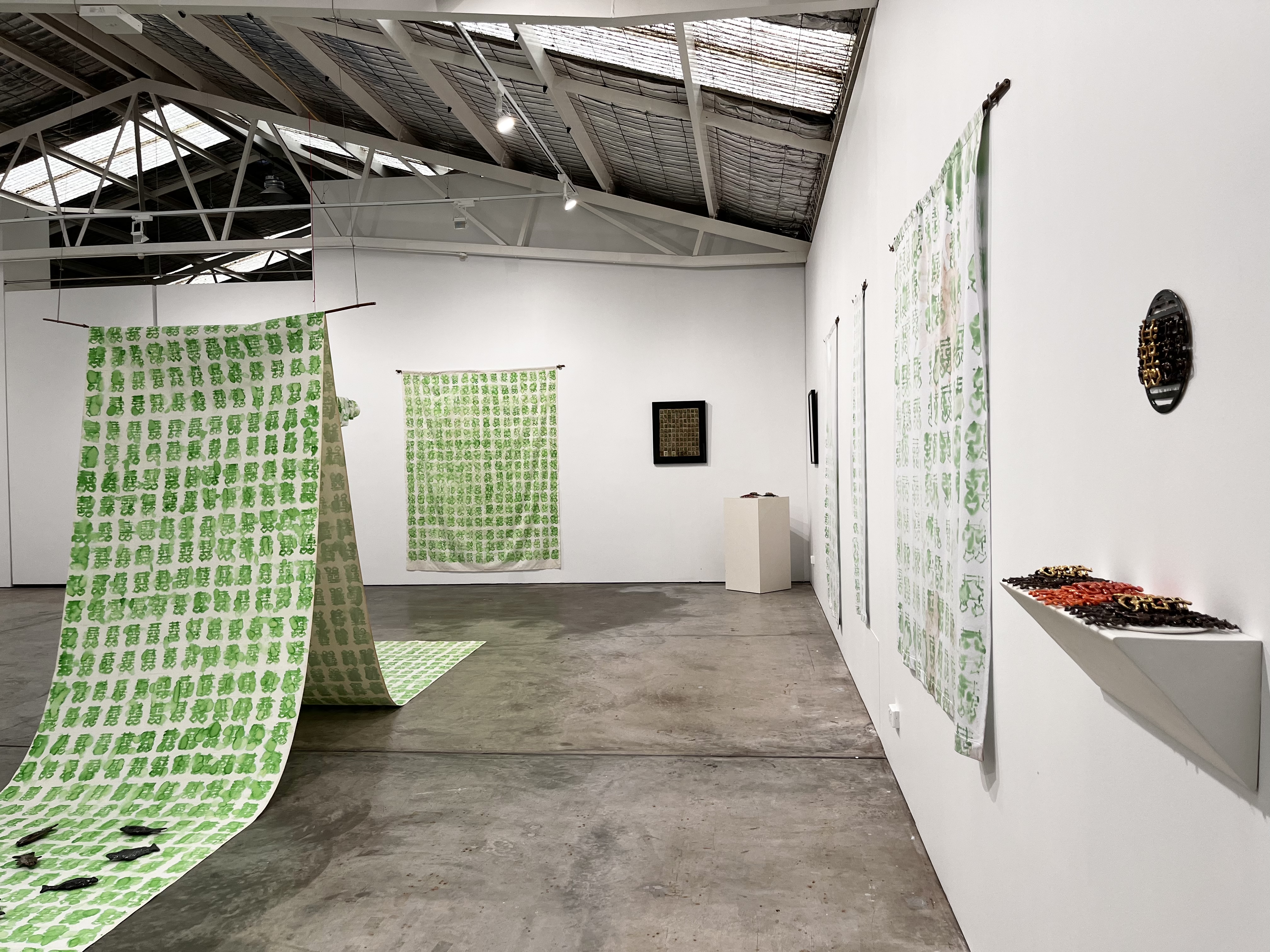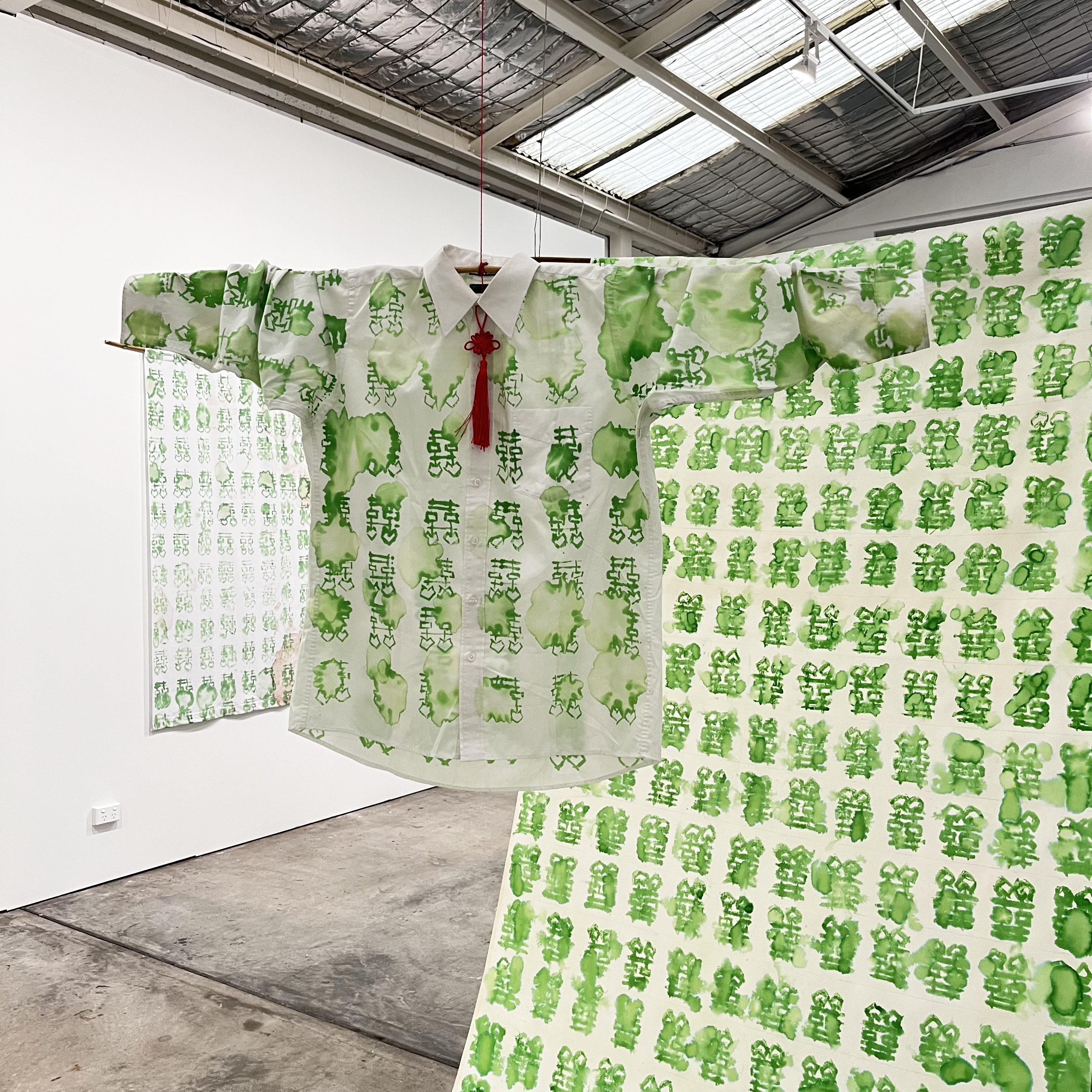 The pandan leaf, a tropical plant native to Southeast Asia commonly used for cooking, is at the heart of many of the works shown here where Tan has used the green pandan dye extract for the paintings on fabric. Evoking olfactory memories through the distinctive vanilla fragrance, these works are accompanied by a collection of ceramic objects depicting popular Indonesian and Australian food. The textile work ‘Brokeback Mountain’ sits at the centre of Into My Mother’s Garden, the shirt arms appearing as a chandelier suspended from the ceiling. The double happiness symbol is printed in pandan extract onto a men’s shirt and tied with red string from North Sumatra – a symbol of the artist’s connection to his childhood. The double happiness symbol, commonly used in the Chinese tradition 囍, is associated with marriage and family unity. The artist deviates the symbol from its conventional use, applying it to a context that emphasises harmony, pride and balance through various forms of kinship, including same-sex love. Several pandan paintings of the double happiness symbol resonate throughout the exhibition as a reference to the forgotten family historical connections to the Malacca community through the Straits of Malacca. Tan recalls that his ancestors were among the ‘boat people’ who smuggled themselves from China to Belawan Port in North Sumatra during Dutch colonial times. They travelled through the Strait of Malacca canal in pursuit of a better life in a new land.