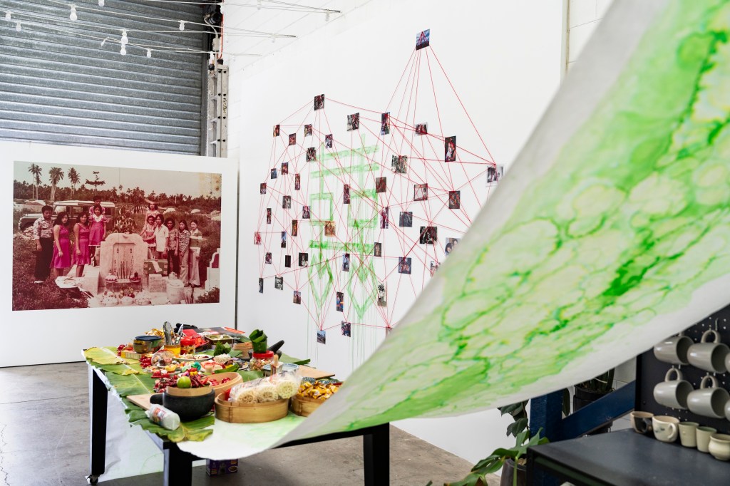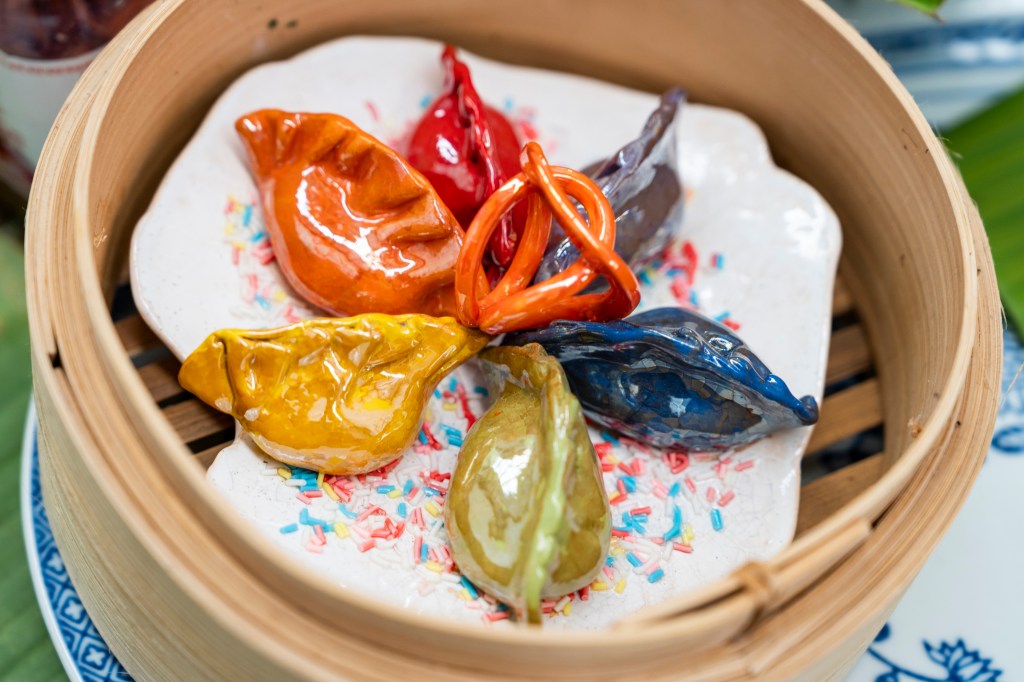 A selection of his early work is included in the exhibition, on the table in a sumptuous display. Some morsels are fashioned in clay, while others are available to eat. Surrounding the feast are rice paper scrolls painted with pandan, a herb that reminds Jayanto of his childhood. In his family’s back garden, pandan grew wildly behind the chicken and duck coop. He was often tasked with harvesting the plant for his mother for cooking.