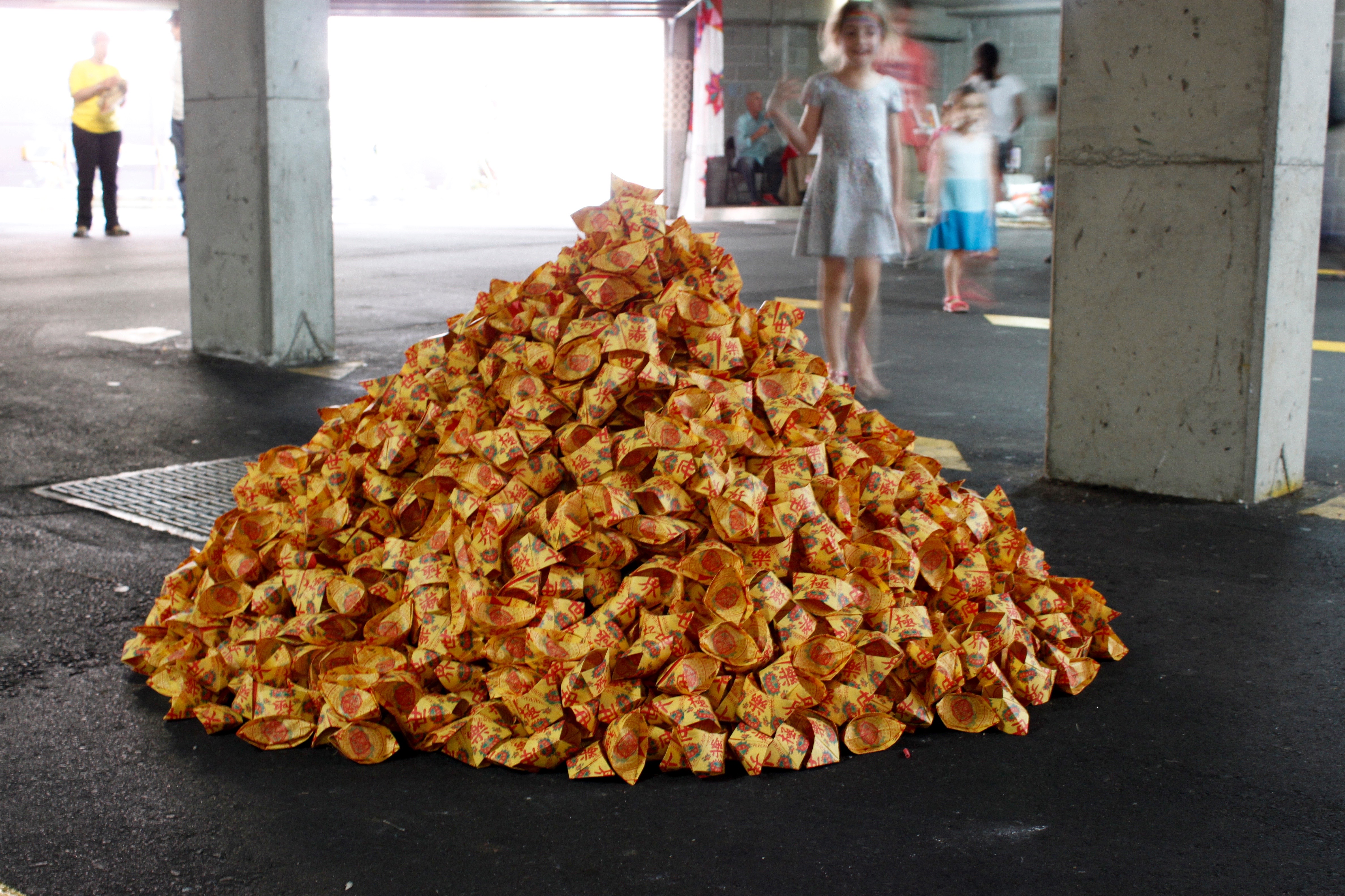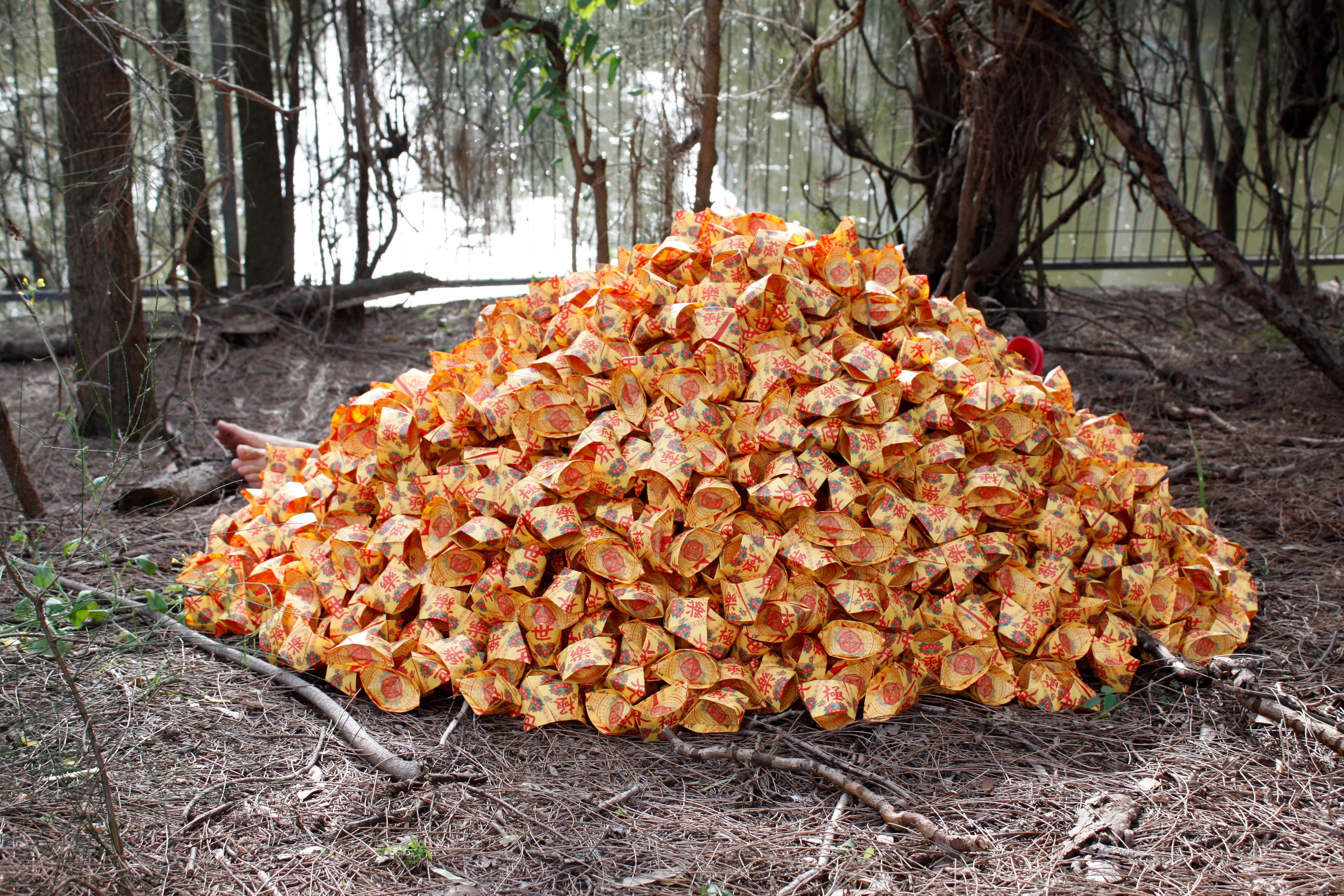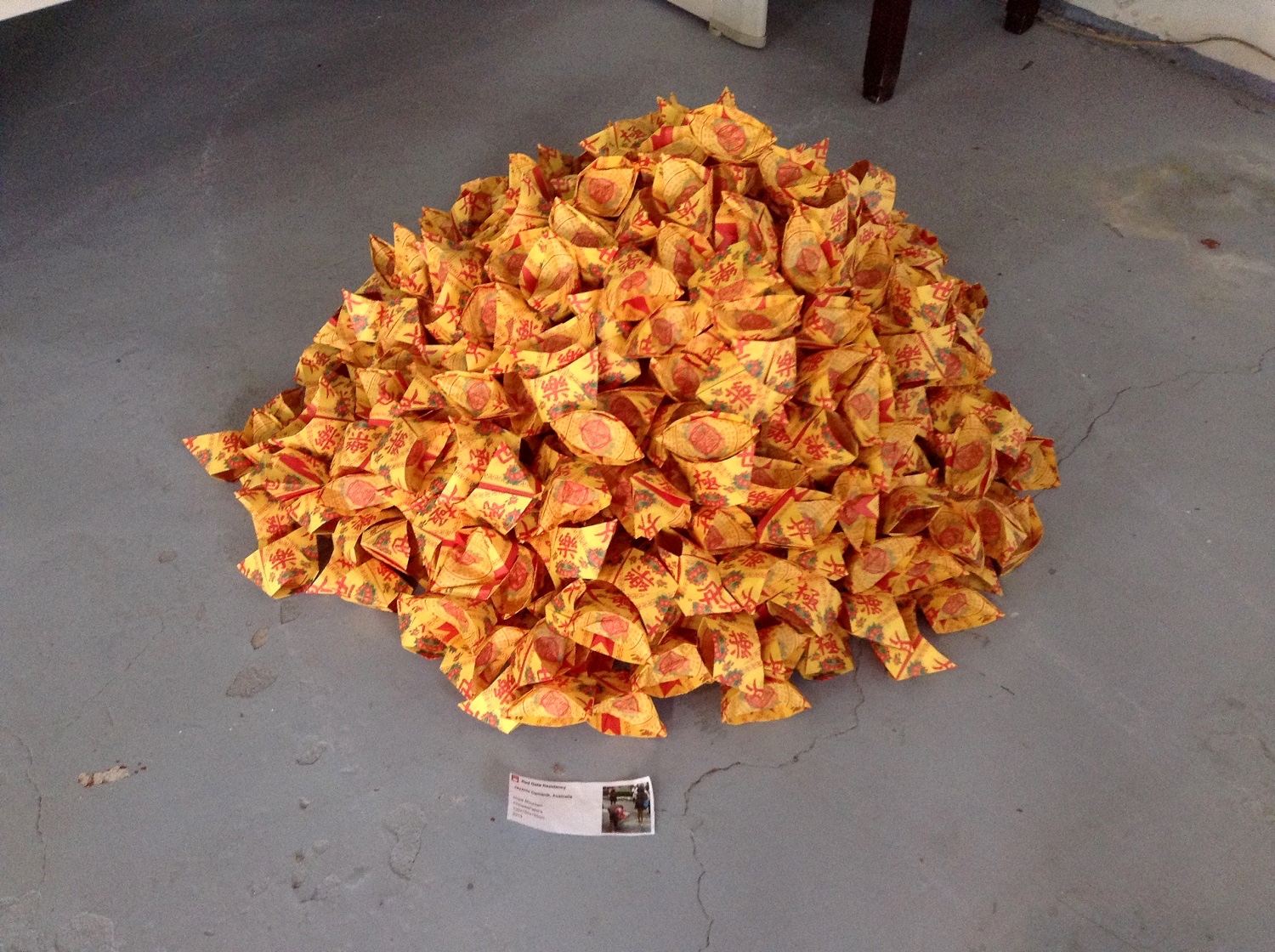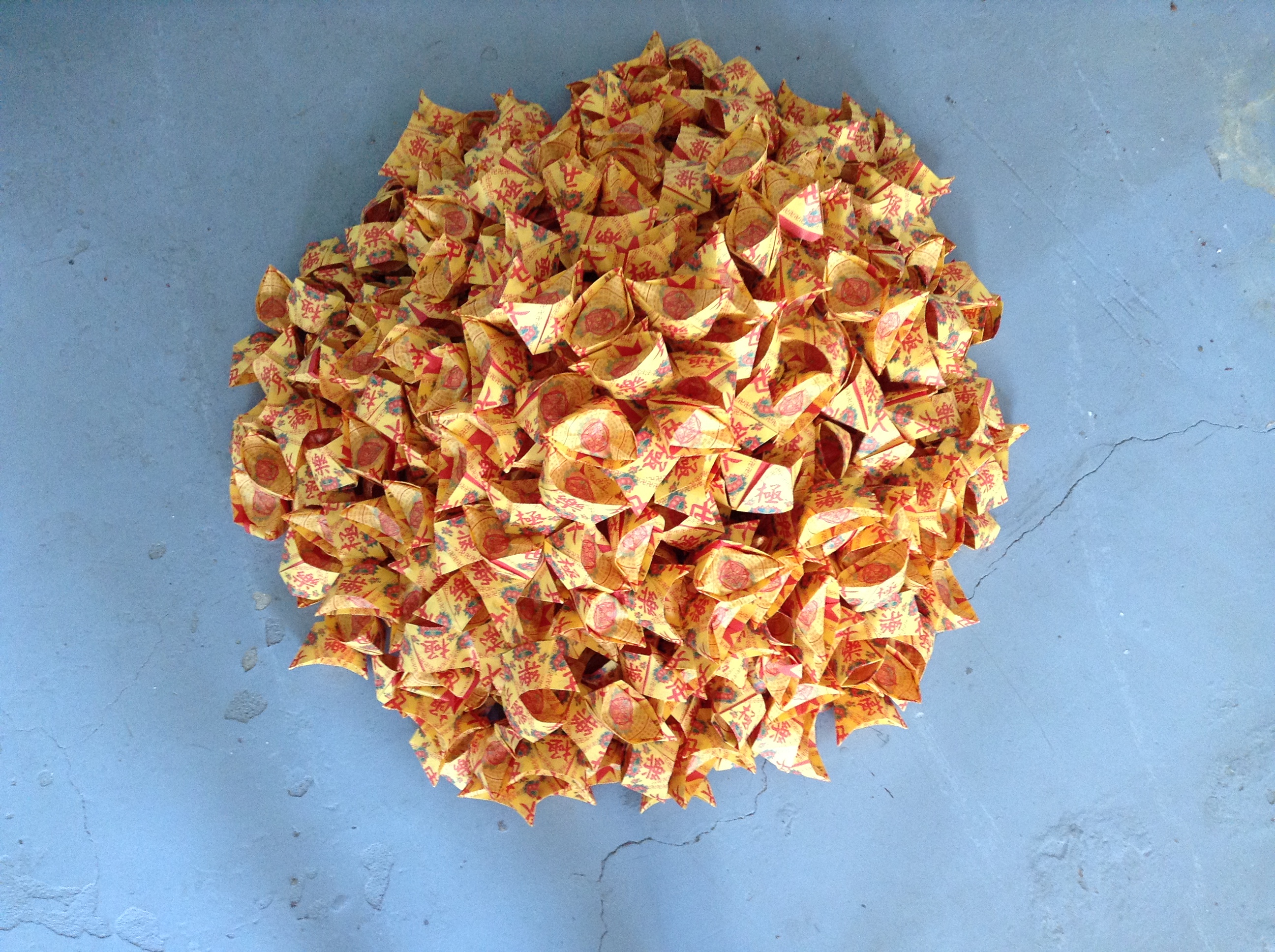 As a child, Jayanto would sit and watch his beautiful mother delicately fold papers into Yuan Bao Lanterns for his Taoism father. These lanterns imitate the gold ingot currency of Imperial China and announced good luck. In Ritual Looking For The Enlightenment, Jayanto recreates these lanterns to express personal experiences of ‘otherness’.